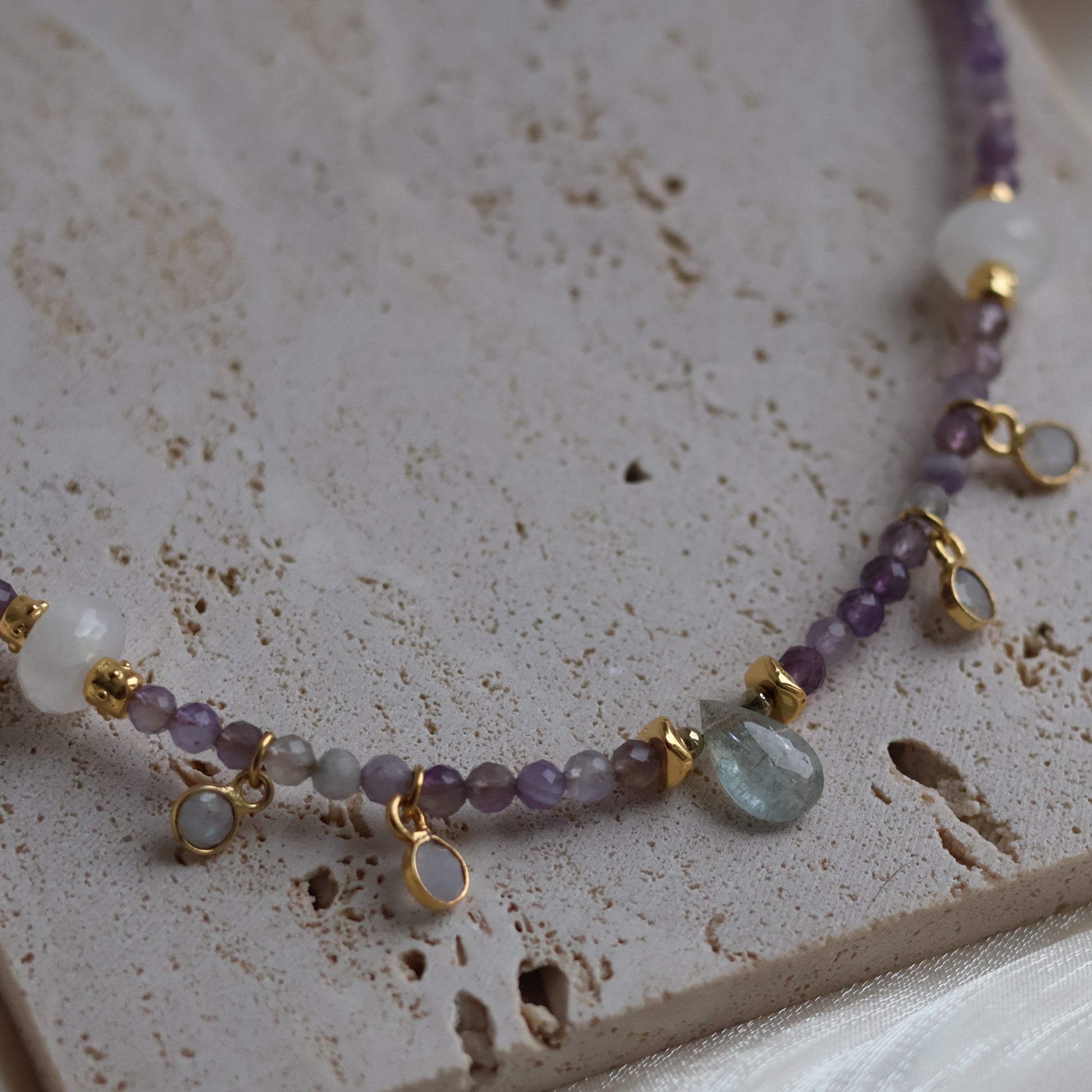 Ses pierres fines soigneusement sélectionnées — pierre de lune, améthyste et labradorite — apportent chacune leurs vertus :